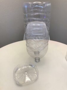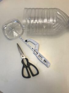 We used two plastic bottles, scissors, a saw, a drill, a pen, a ruler, and thread.