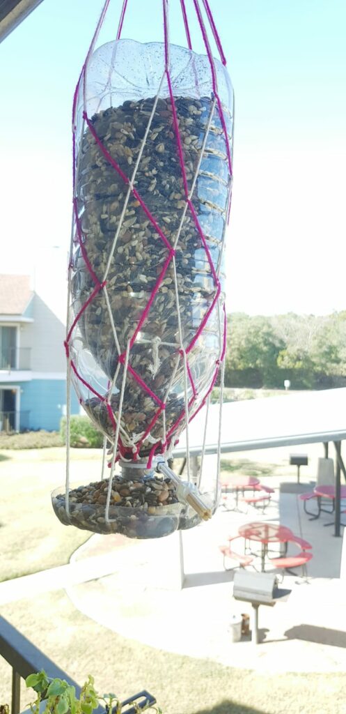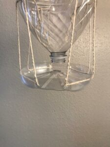 First, we cut off both the bottle head and the bottom. Then, I made a simple macrame pattern out of the cords and connected it to the bottle head. Next, we cut off the bottle head from the second bottle (but just a little). Finally, we made holes in the sides of the bottle to attach to the bottom of the first bottle.